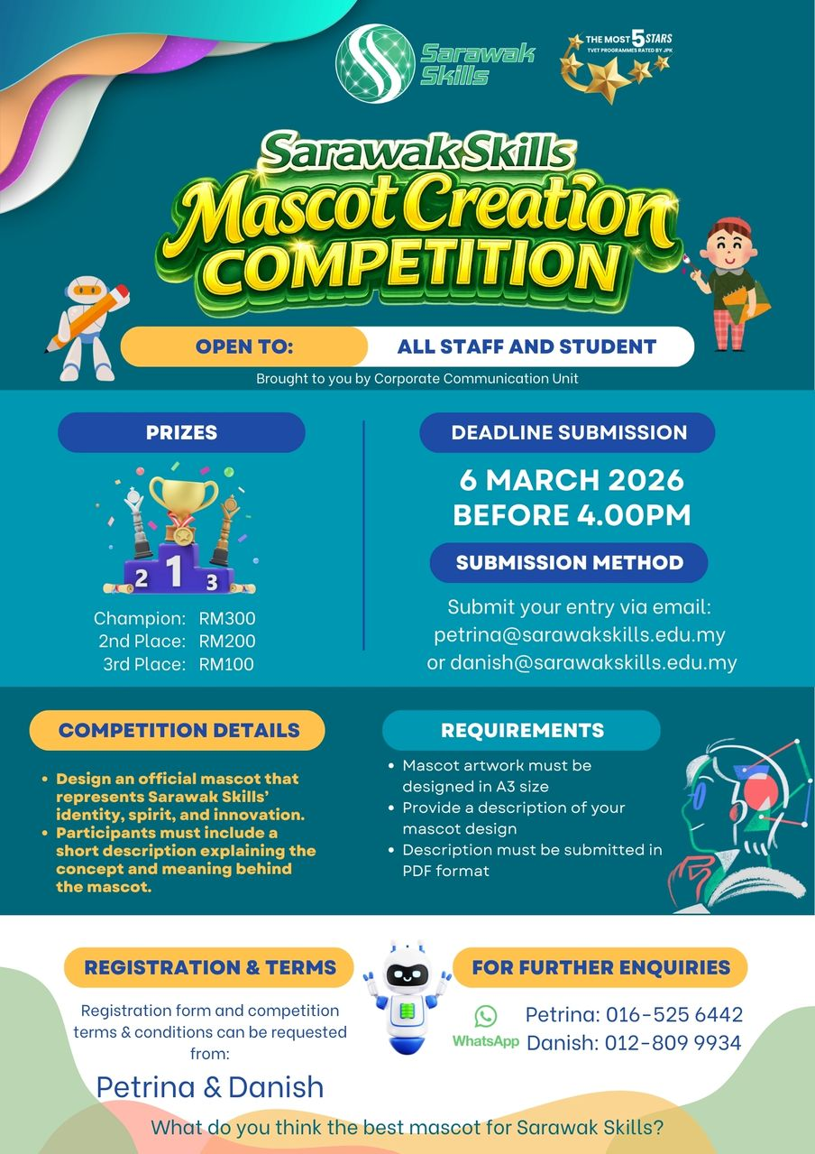 We are excited to announce the Sarawak Skills Mascot Creation Competition, proudly brought to you by the Corporate Communication Unit.